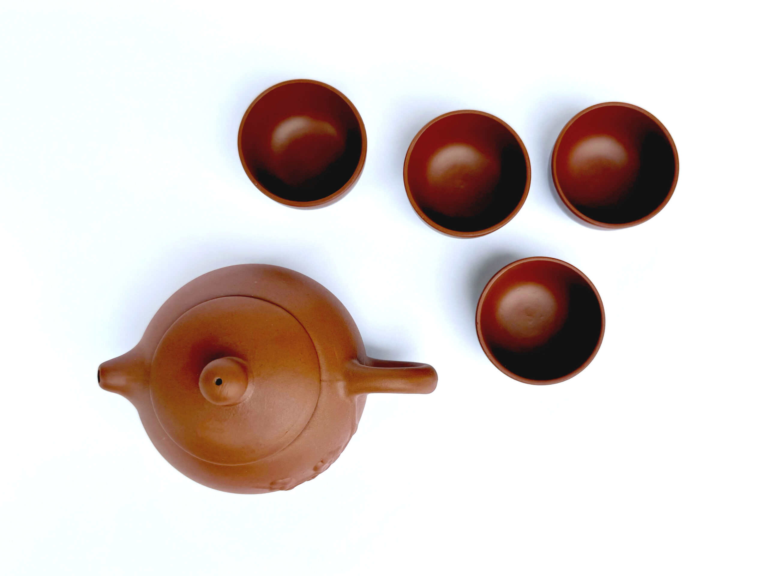 Before first use, rinse all pieces with hot water. Do not use soap, as clay is porous and absorbs flavor. After each session, rinse thoroughly with water and allow to air dry completely. Over time, the teapot will develop a patina that reflects your tea practice—handle with care and appreciation