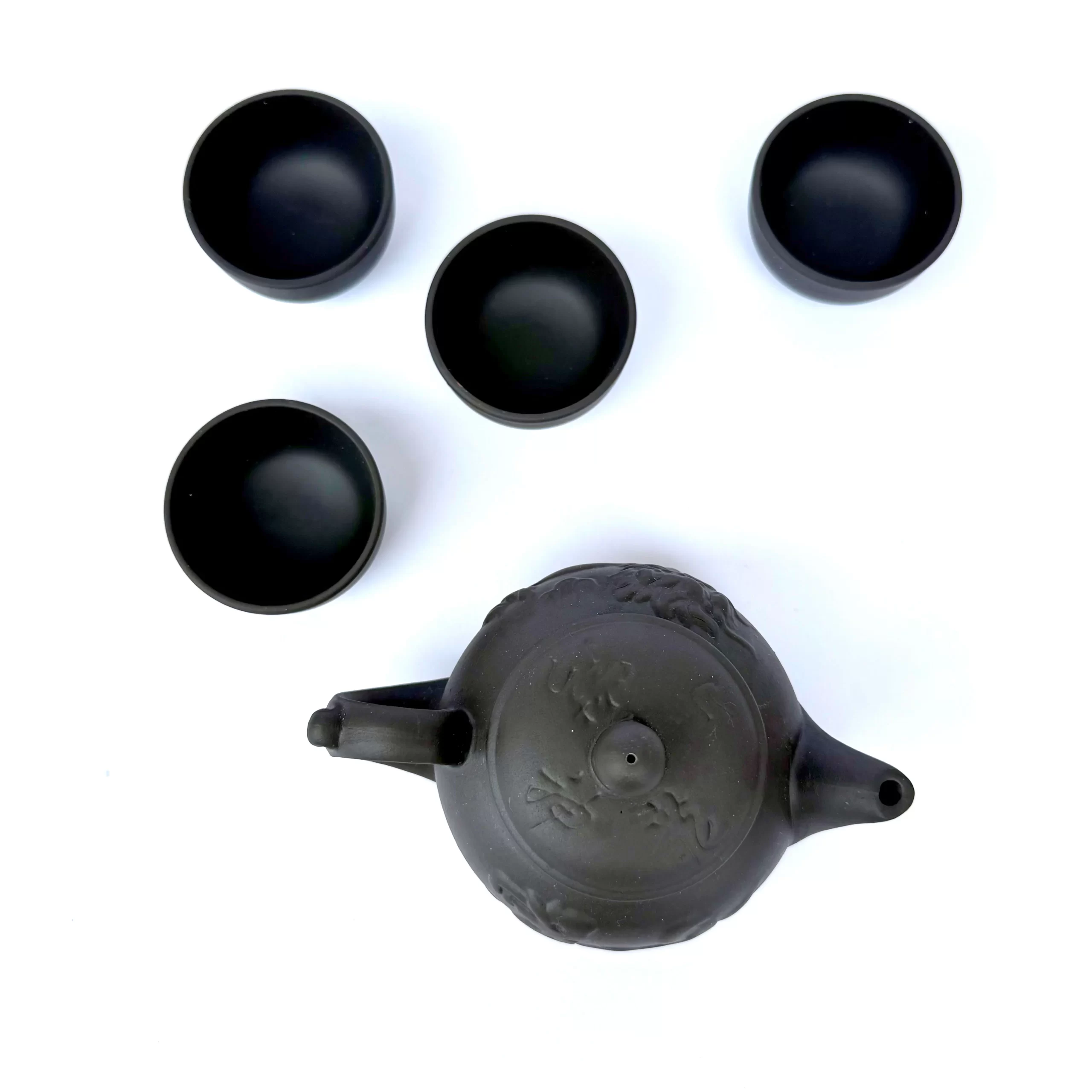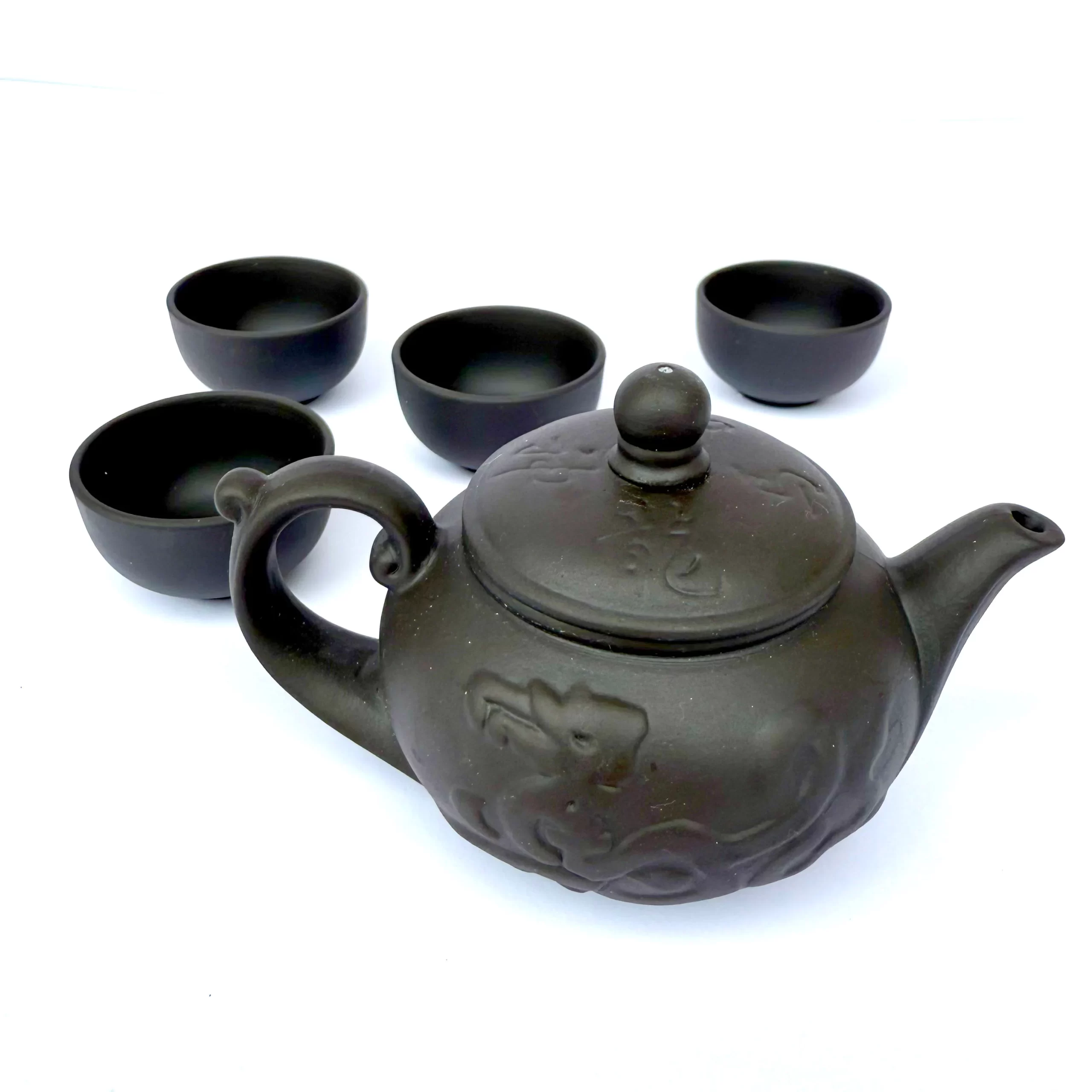 This stout dark brown clay teapot commands presence with a beautifully raised dragon motif curling around its body. The rich, unglazed clay and sturdy shape evoke warmth and strength—a true centerpiece for grounding your tea ritual